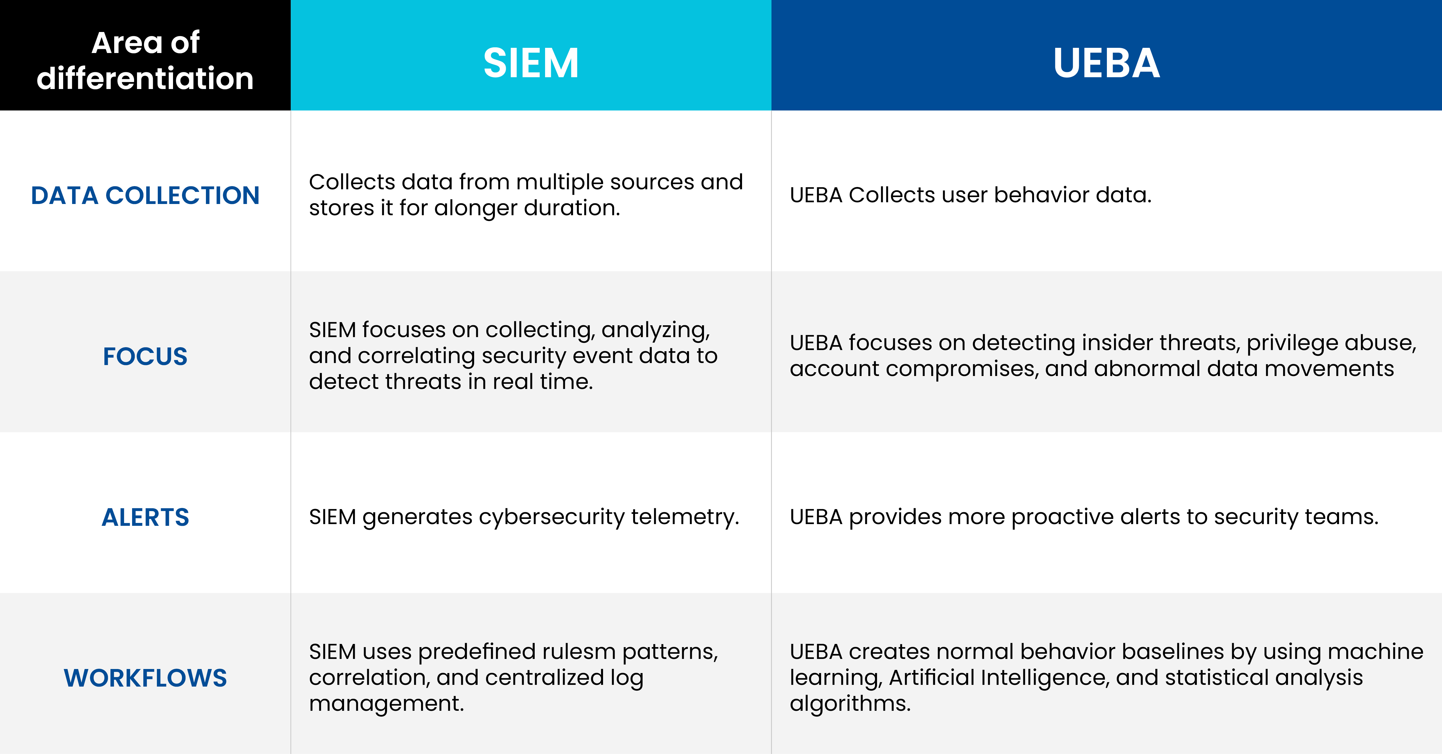 Unlike traditional security tools, which focus on known threats, UEBA identifies patterns and deviations from normal activity, enabling proactive threat detection and reducing false positives.